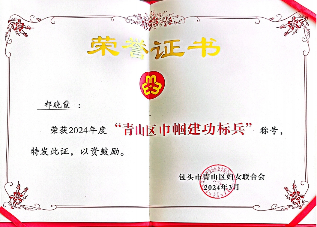 2024年3月7日上午,青山区妇联举行了庆祝第114个“三八”国际劳动妇女节表彰大会,青山区国资委荣获2024年度“青山区三八红旗集体”称号,内蒙古中青未来教育文化产业发展(集团)有限公司党委书记、董事长高利荣获“青山区三八红旗手”、包头市青山区文化旅游产业投资有限责任公司董事会祁晓霞荣获“青山区巾帼建功标兵”称号。