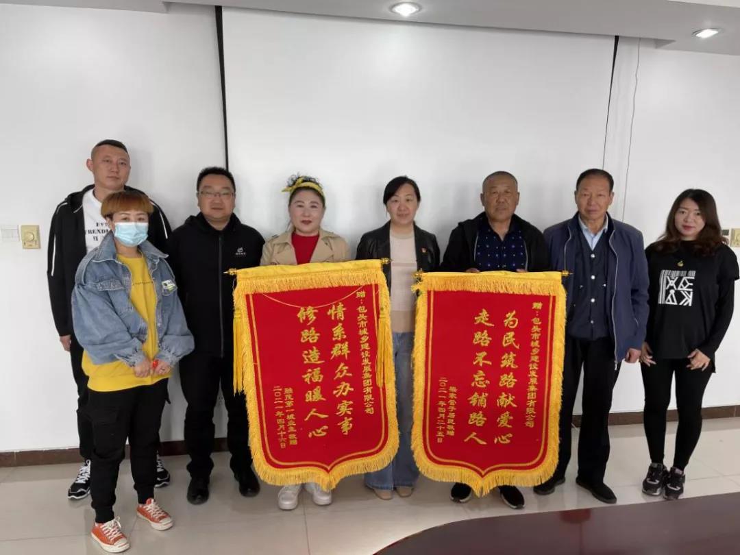 4月26日上午,九原区沙河街道韩庆坝的居民代表将绘有“情系群众办实事,修路造福暖人心”和“为民筑路献爱心,走路不忘铺路人”的两面锦旗送到城发集团手中,以此感谢城发集团前段时间的为民筑路之情。