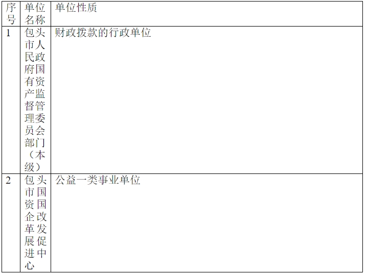 2.从决算单位构成看,纳入本单位2022年度部门汇总决算编制范围的预算单位共计1家,具体包括:包头市人民政府国有资产监督管理委员会(部门)。详细情况见表: