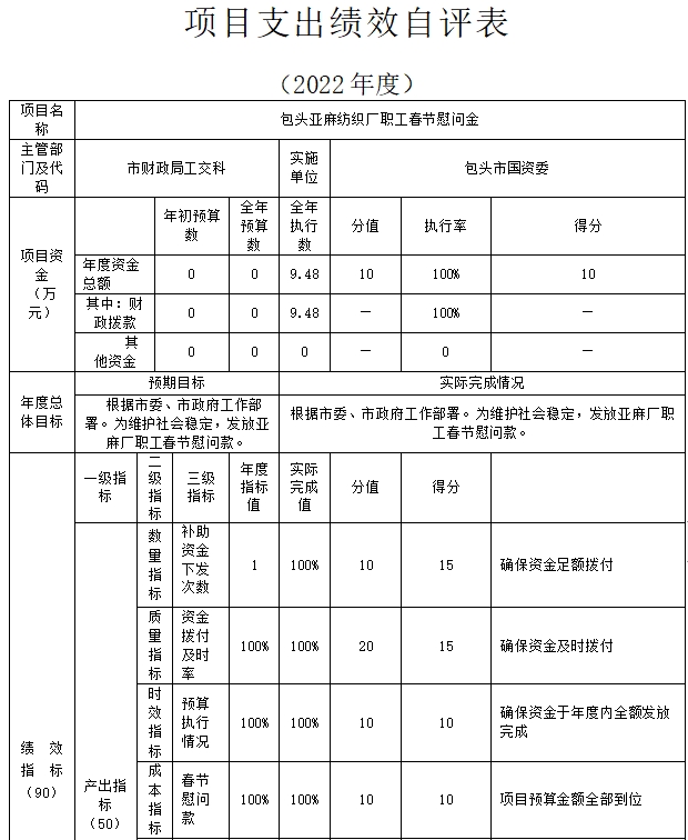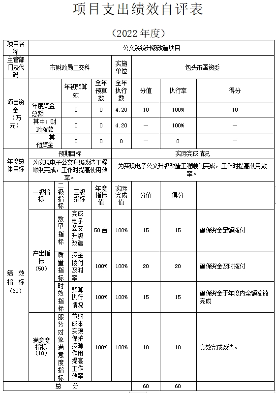 包头市人民政府国有资产监督管理委员会(部门)单位2022年度在决算中反映0个一般公共预算项目,以及0个政府性基金项目。共5个项目的绩效自评结果。