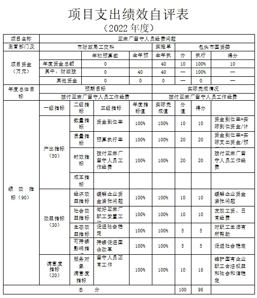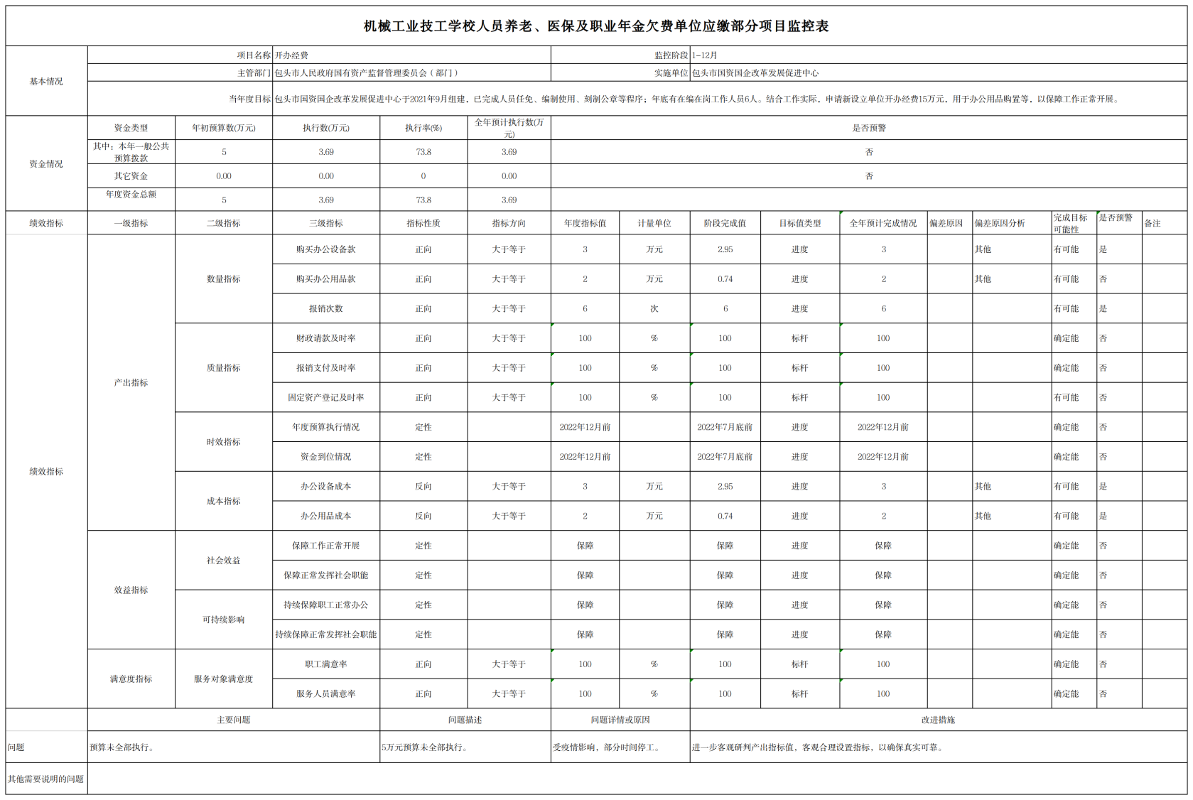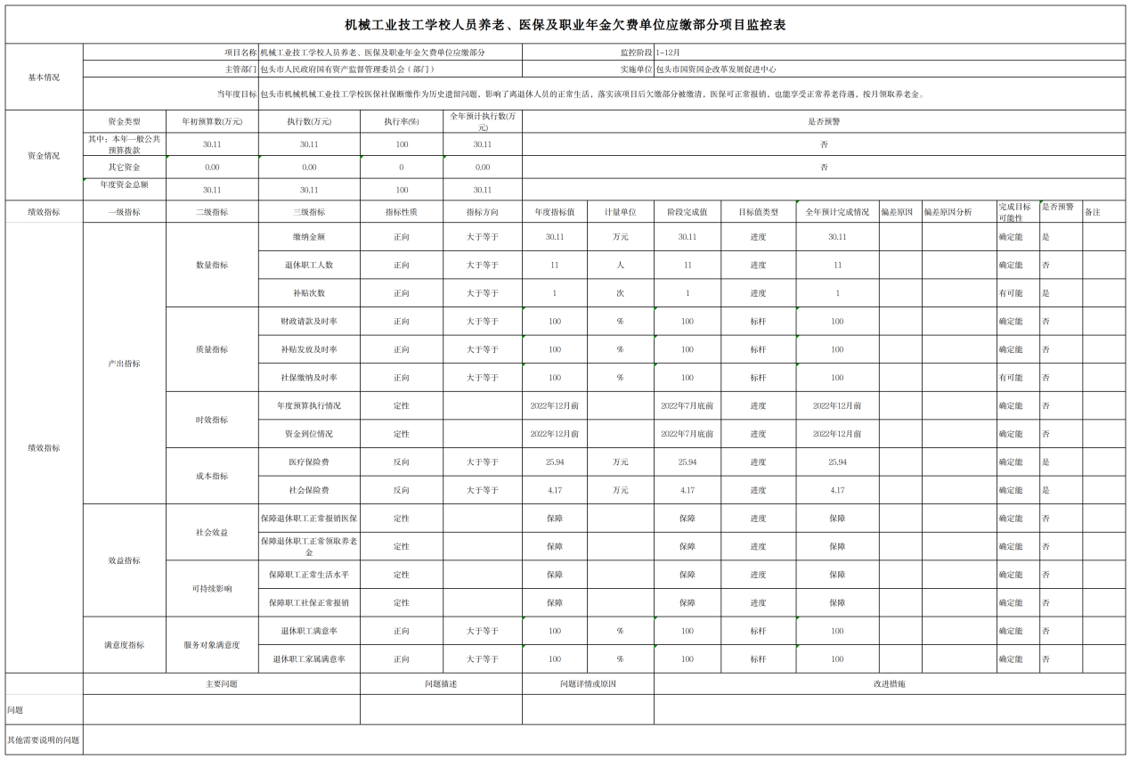 2.机械工业技工学校人员养老、医保及职业年金欠费单位应缴部分项目自评综述:根据年初设定的绩效目标,项目自评得分97分。全年预算数为30.11万元,执行数为30.11万元,完成预算的 100 %。项目绩效目标完成情况:为机械工业技工学校人员补缴欠缴的养老、医保及职业年金欠费单位应缴部分,保障退休人员享受退休待遇。发现的主要问题及原因:无。下一步改进措施:无。