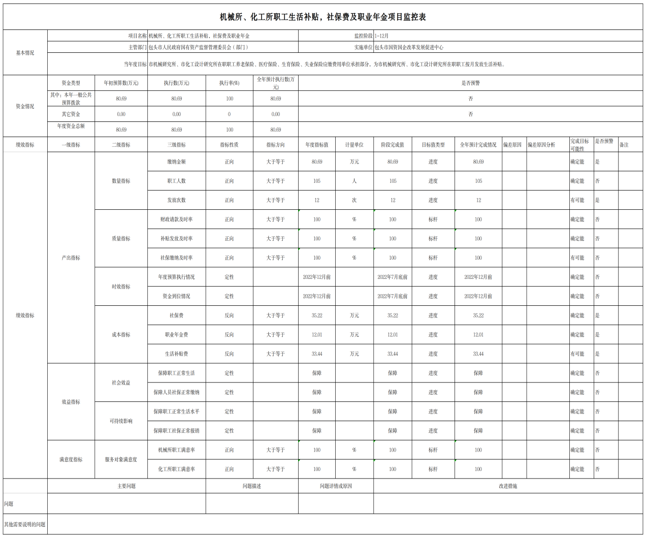 1.机械所/化工所职工生活补贴,社保费及职业年金项目自评综述:根据年初设定的绩效目标,项目自评得分95 分。全年预算数为80.69万元,执行数为80.69 万元,完成预算的 100 %。项目绩效目标完成情况:为机械所/化工所职工按月发放生活补贴,按月为其缴纳社保费及职业年金。发现的主要问题及原因:无。下一步改进措施:无。