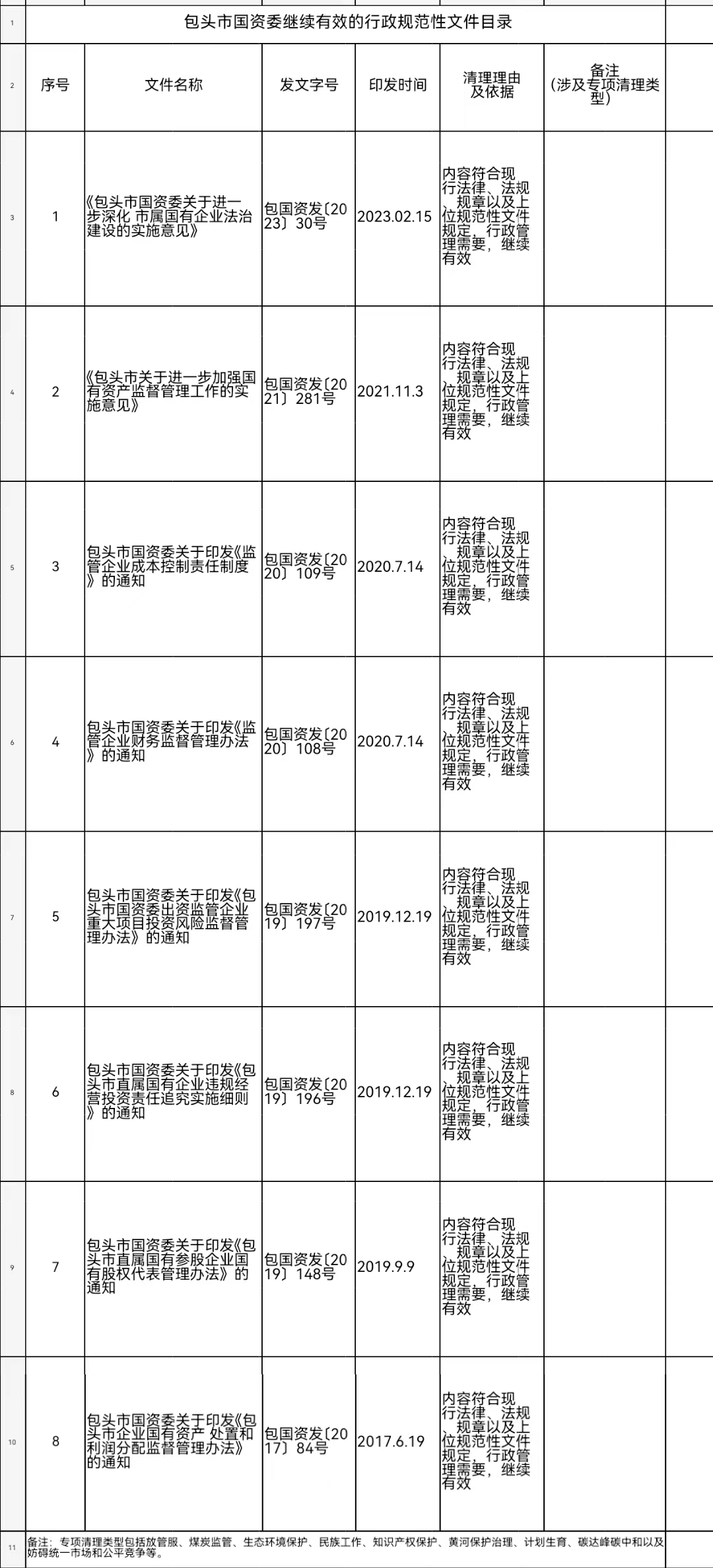 包头市国资委继续有效的行政规范性文件目录