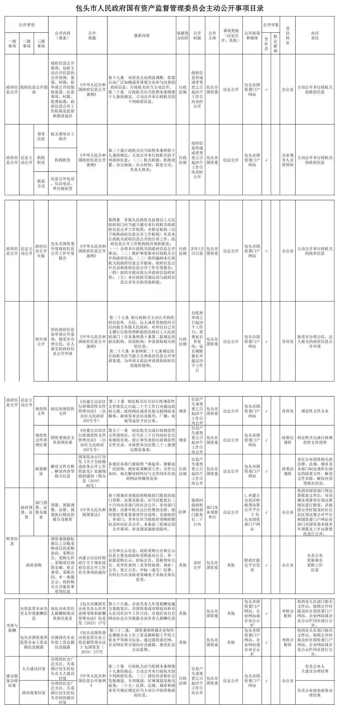 包头市人民政府国有资产监督管理委员会主动公开事项目录